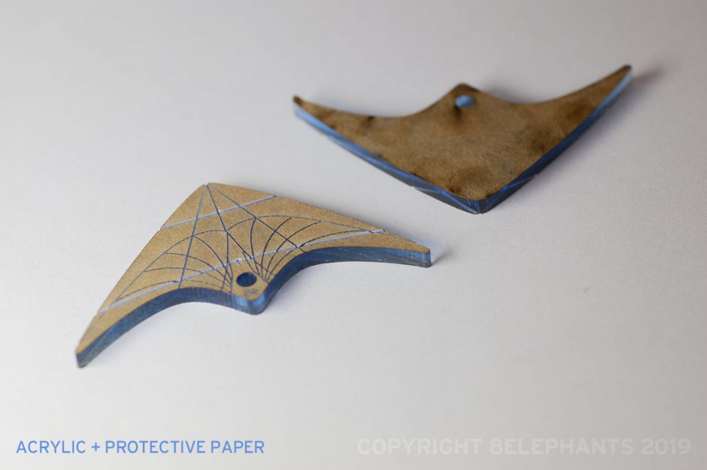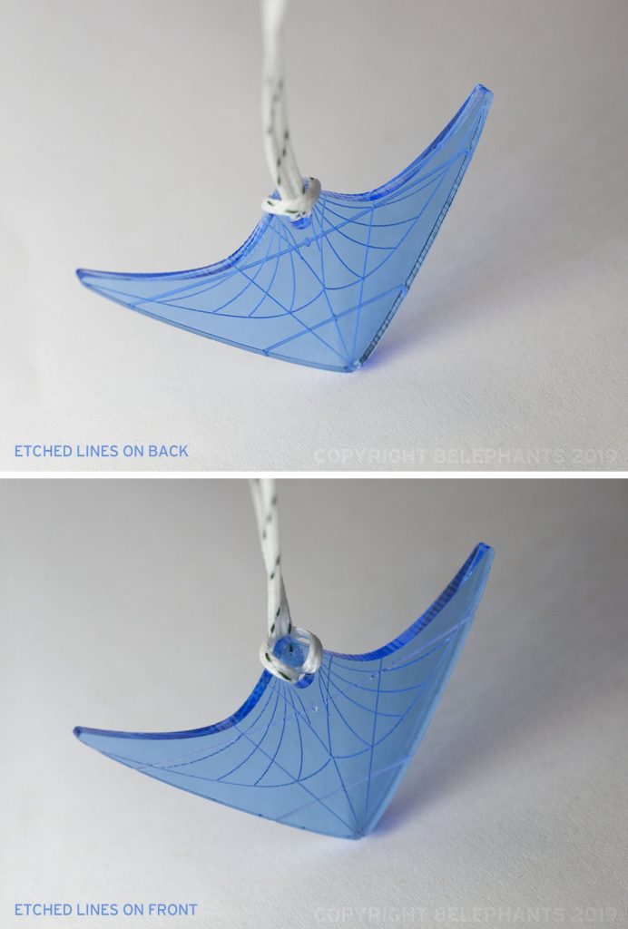 Another example of the light reflections with the zipper pull being dangled as it would on my bag. Notice how the thicker area engraved lines are hardly visible on the lower image. For the next batch of these, I’d probably remove some of the smaller lines towards the lanyard hole as that would reduce the laser cutting cost without loosing impact of the design.