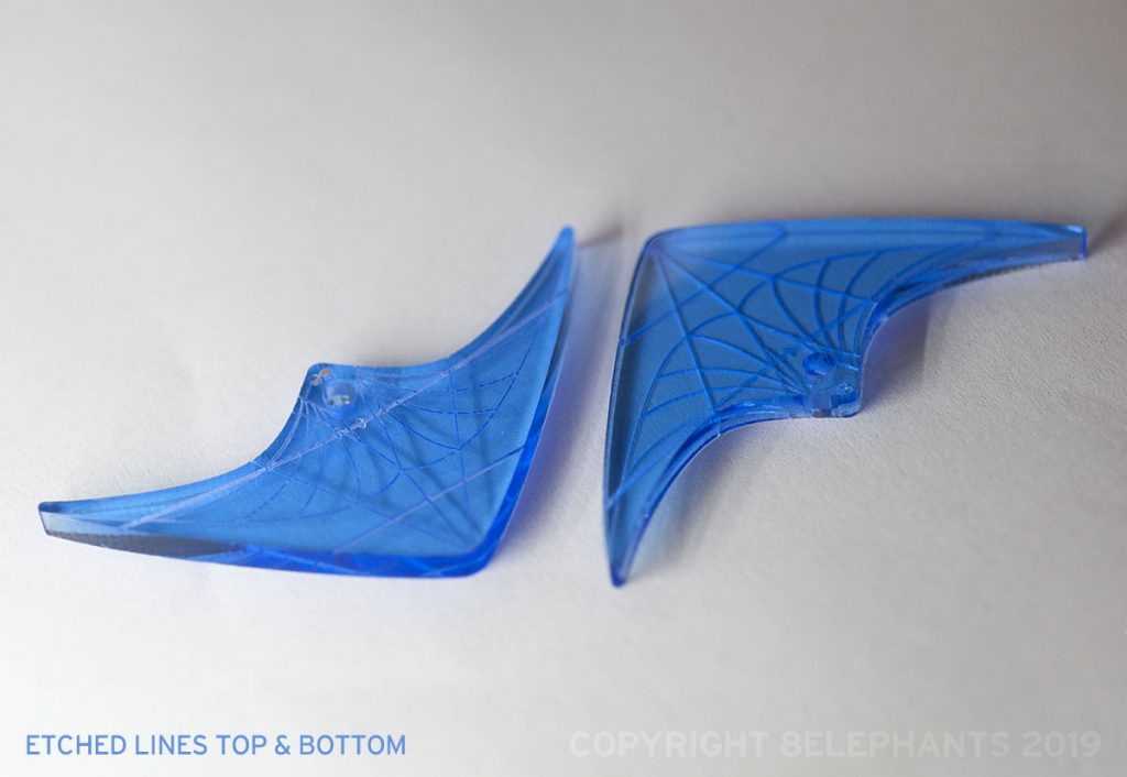 Here is the same design as in the previous post in a transparent format. What’s really great about this material is that the engraved lines change from dark to light with the angle of light rays & reflections. This this type of design often utilizes the contrast of fluorescent material, but the lines are clearly visible with this non-flourscent material too; albeit more subtle.